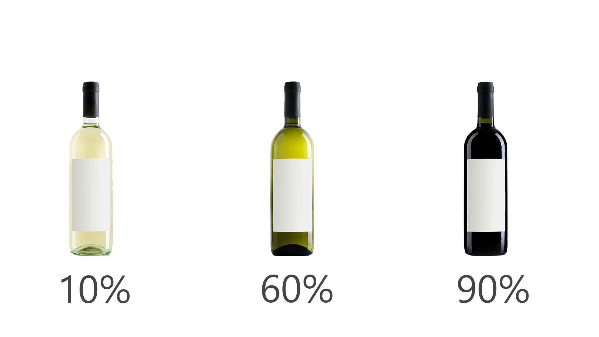 Las botellas de color blanco transparente solo filtran una pequeña parte de la luz, aproximadamente el 10%. En el medio, tenemos las botellas verde más comunes en vino. Estas llegan a filtrar el 60% de la luz. Por último, y con la máximo protección tenemos el color topacio, donde también podíamos incluir el color ámbar. Estas botellas de vidrio son capaces de filtrar hasta el 90% de la luz.